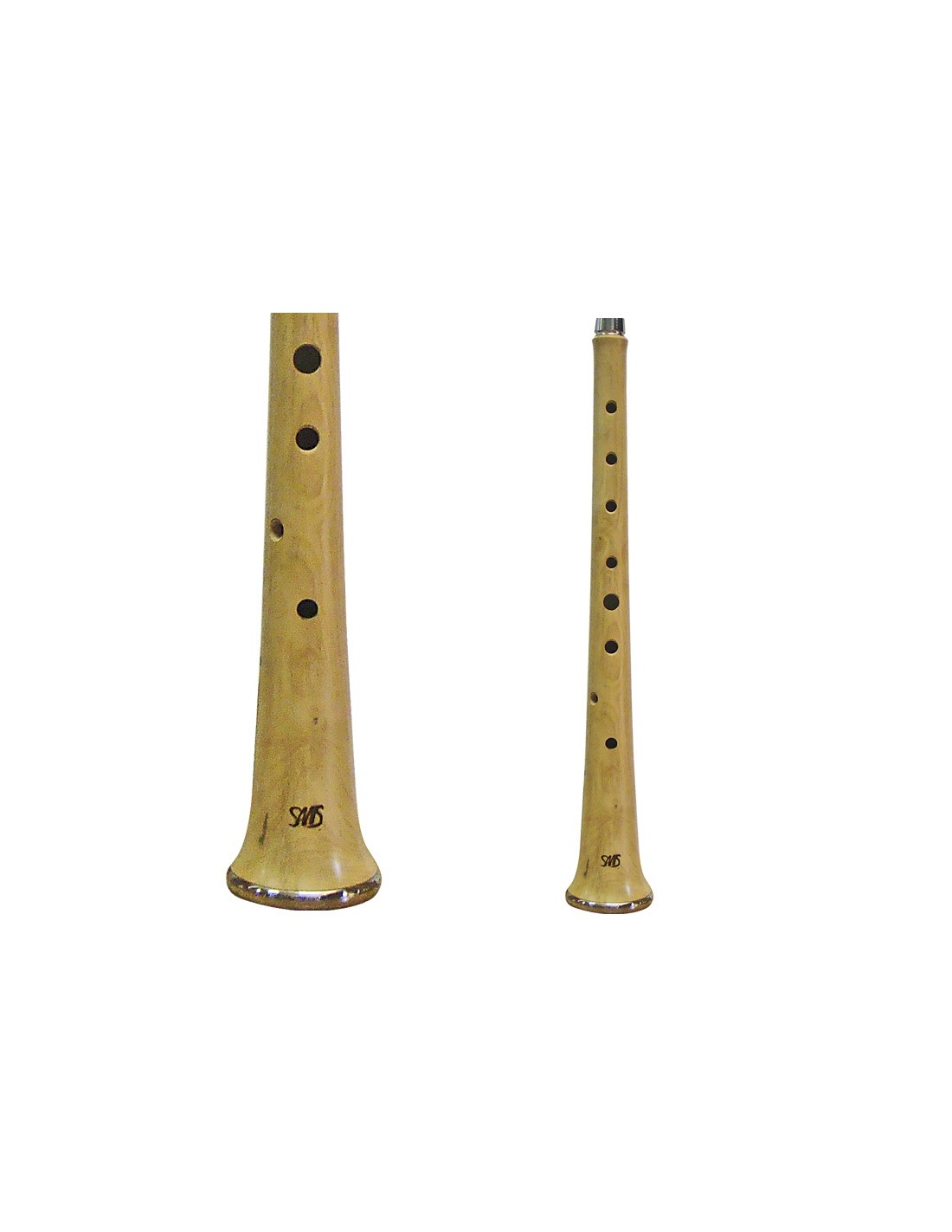 The sweet shaped Galla is a traditional oboe (with cylindrical inner bore), fitted as well with double reed. The main difference between the simple shaped and the sweet shaped Gralla is in its length (it is a bit longer), the bell is lightly curved and the inner bore is narrower, which allows a more attenuated sound with more balanced harmonics and more nuances (piano forte). The sweet shaped Gralla allowes the sensible SOL note: FA#. Two, four, fife and eight keys can be mounted to the instrument. Standard tuning is SOL4 (LA 440 Hz). The instrument comes with soft case and neck. The reed is not included.