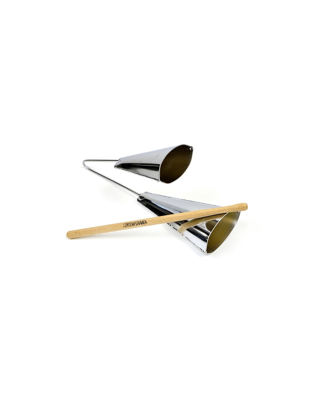 The Contemporanea Agogô is made of chromed metal. Small bell dimensions: 15 x 8 cm, Large bell dimensions: 17.5 x 9 cm. Total length: 32.5 cm