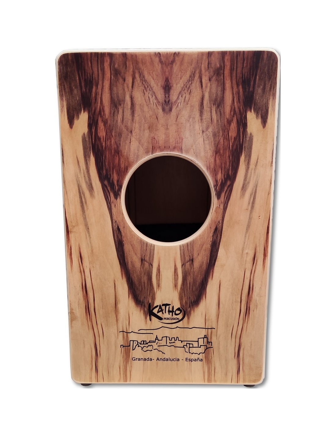 The new Katho Percusión Flamenco Cajón Walnut Custom is a professional instrument with a beautiful and modern aesthetic, featuring a walnut wood front panel and a rear panel made of mesh wood with direct printing.