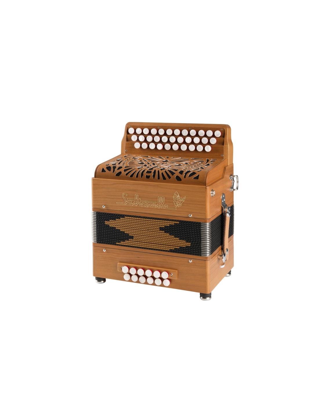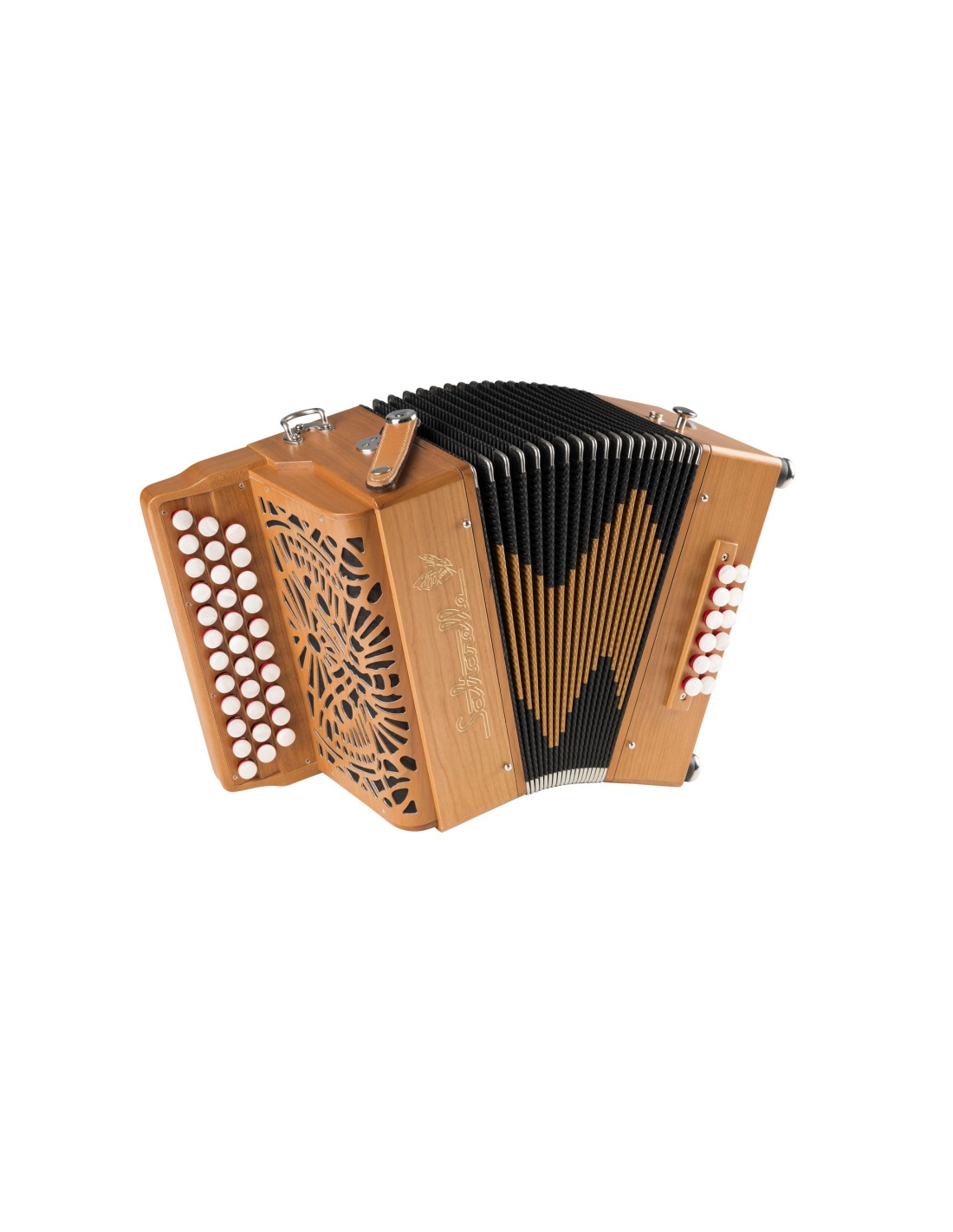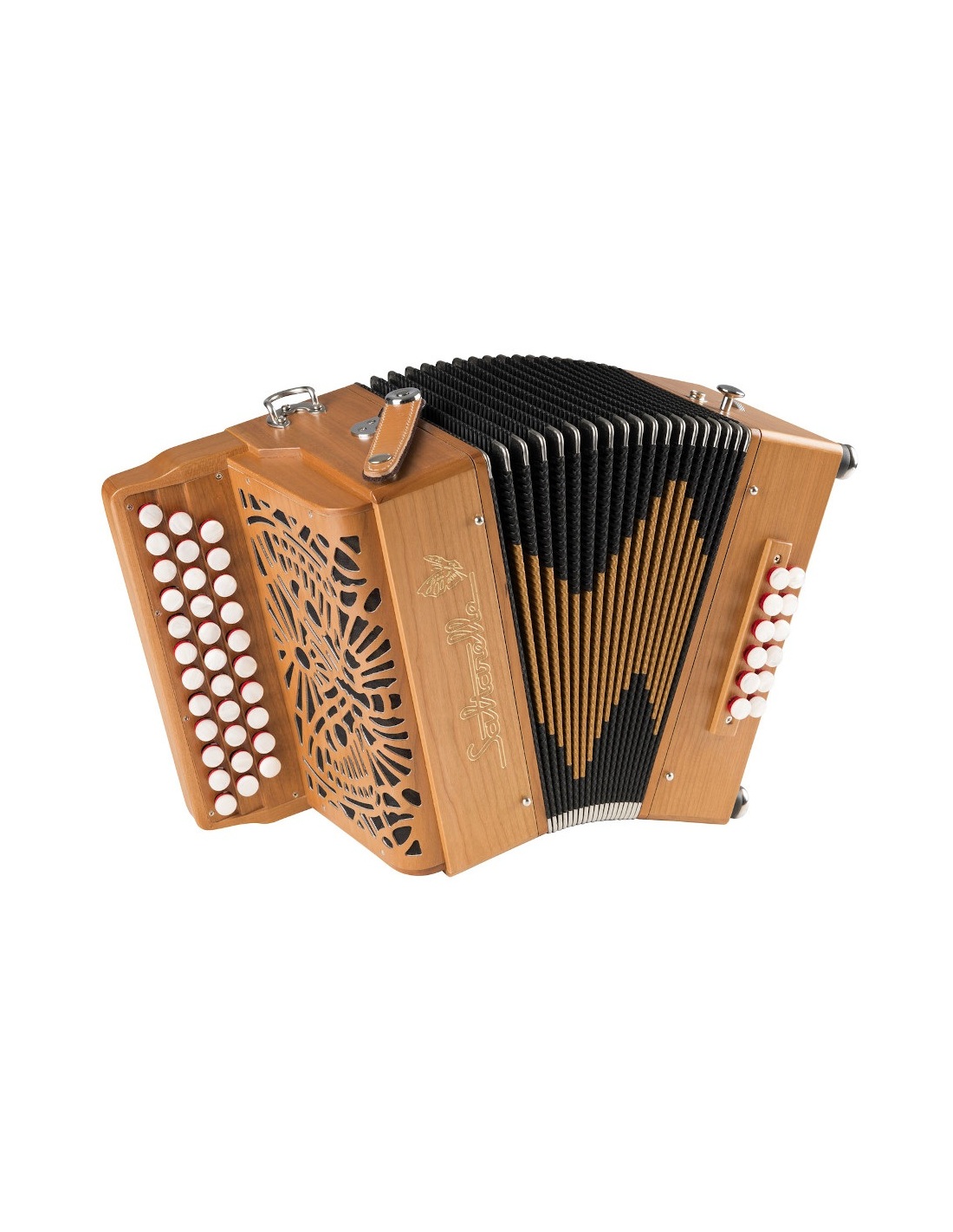 Diatonic accordion. 21 voces, 2 accidental bass buttons. 8 basses with 1 stop to remove the third.