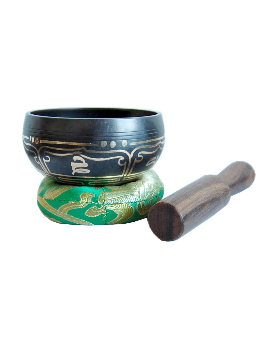 10cm cm Coffee Brown Single Dorje Tibetan bowl with green ring cushion, wooden wave stick. Made in Nepal. 8cm Coffee Brown Fish Design Tibetan bowl with orange ring stick, wooden lotus striker. Made in Nepal. Each bowl is semicircular and is composed of 7 metals: Iron, Copper, Zinc, Brass, Mercury, Gold, and Silver, each of which represents 7 different planetary influences: Gold , the sun Silver , the moon Mercury , Mercury Copper , Venus Iron , Mars Tin , Jupiter Lead , Saturn.