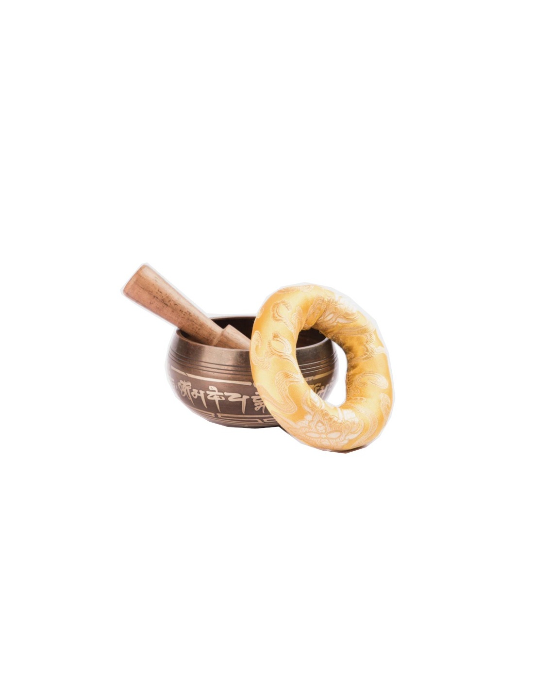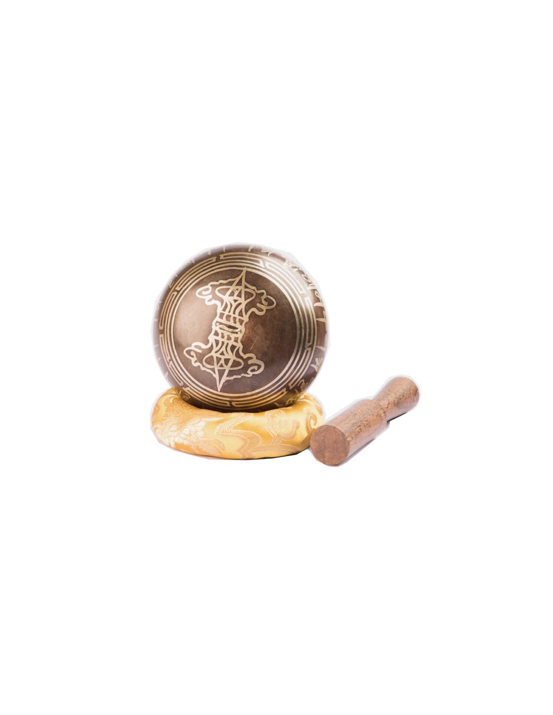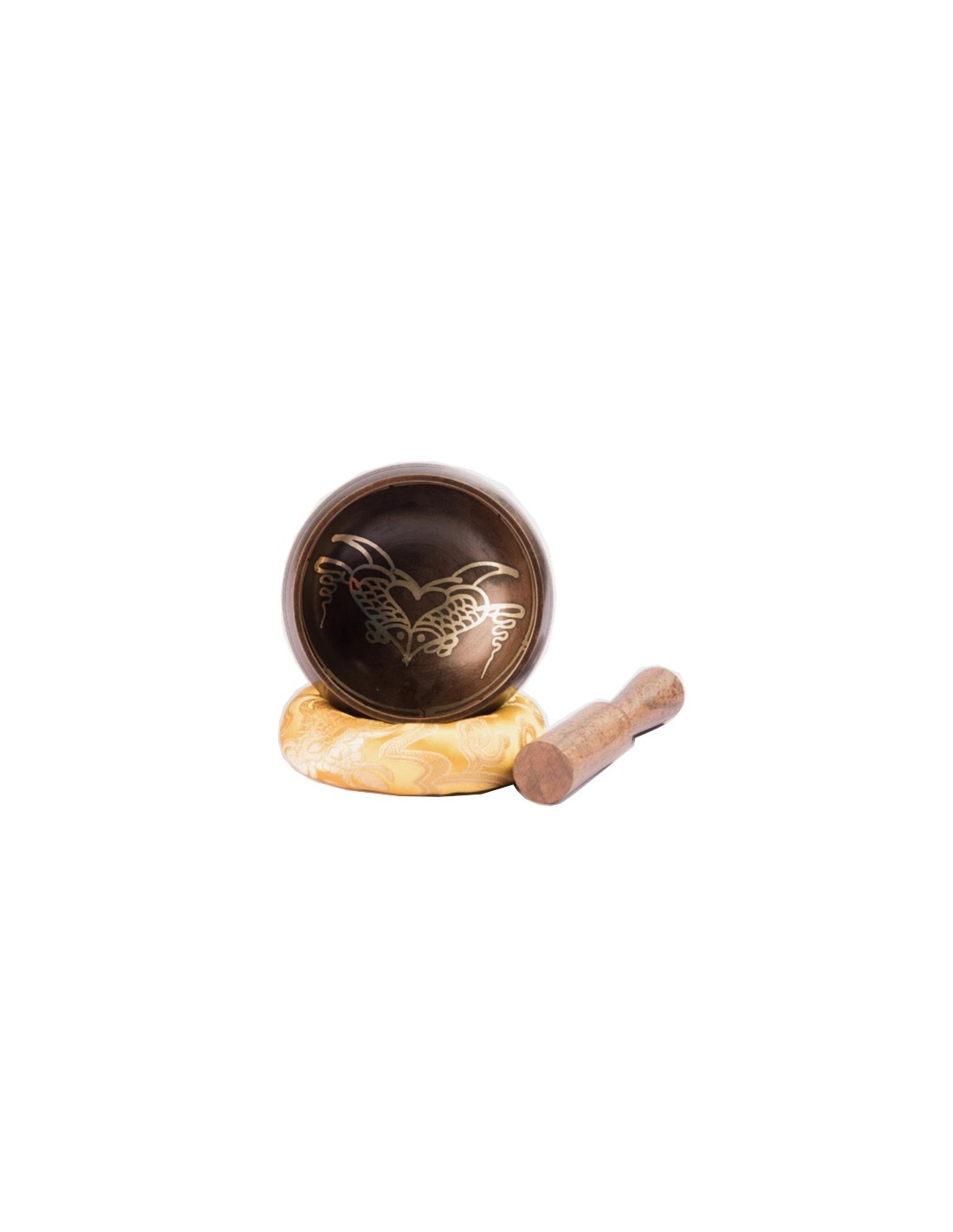 12cm Coffee Brown Fish Design Tibetan bowl with orange ring stick, wooden lotus striker. Made in Nepal. 8cm Coffee Brown Fish Design Tibetan bowl with orange ring stick, wooden lotus striker. Made in Nepal. Each bowl is semicircular and is composed of 7 metals: Iron, Copper, Zinc, Brass, Mercury, Gold, and Silver, each of which represents 7 different planetary influences: Gold , the sun Silver , the moon Mercury , Mercury Copper , Venus Iron , Mars Tin , Jupiter Lead , Saturn.