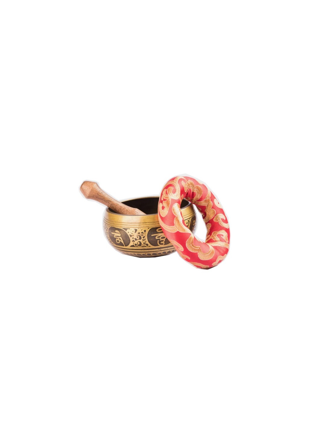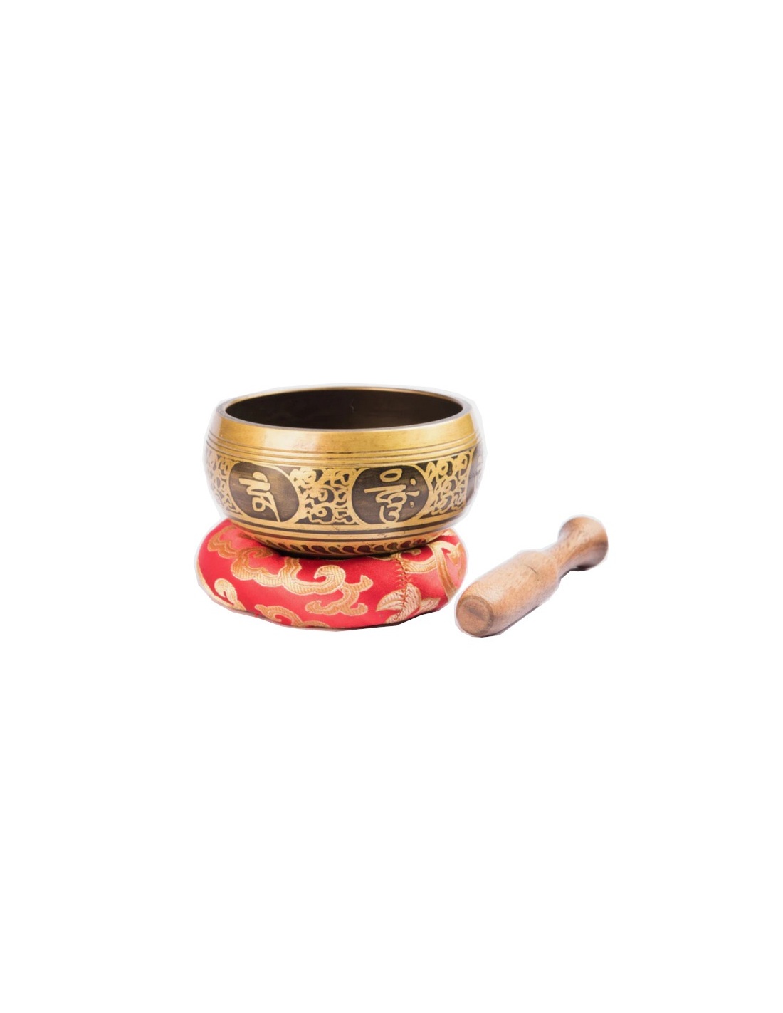 8cm Antique Buddha Eye Tibetan bowl with red ring cushion, wooden striker. Made in Nepal.