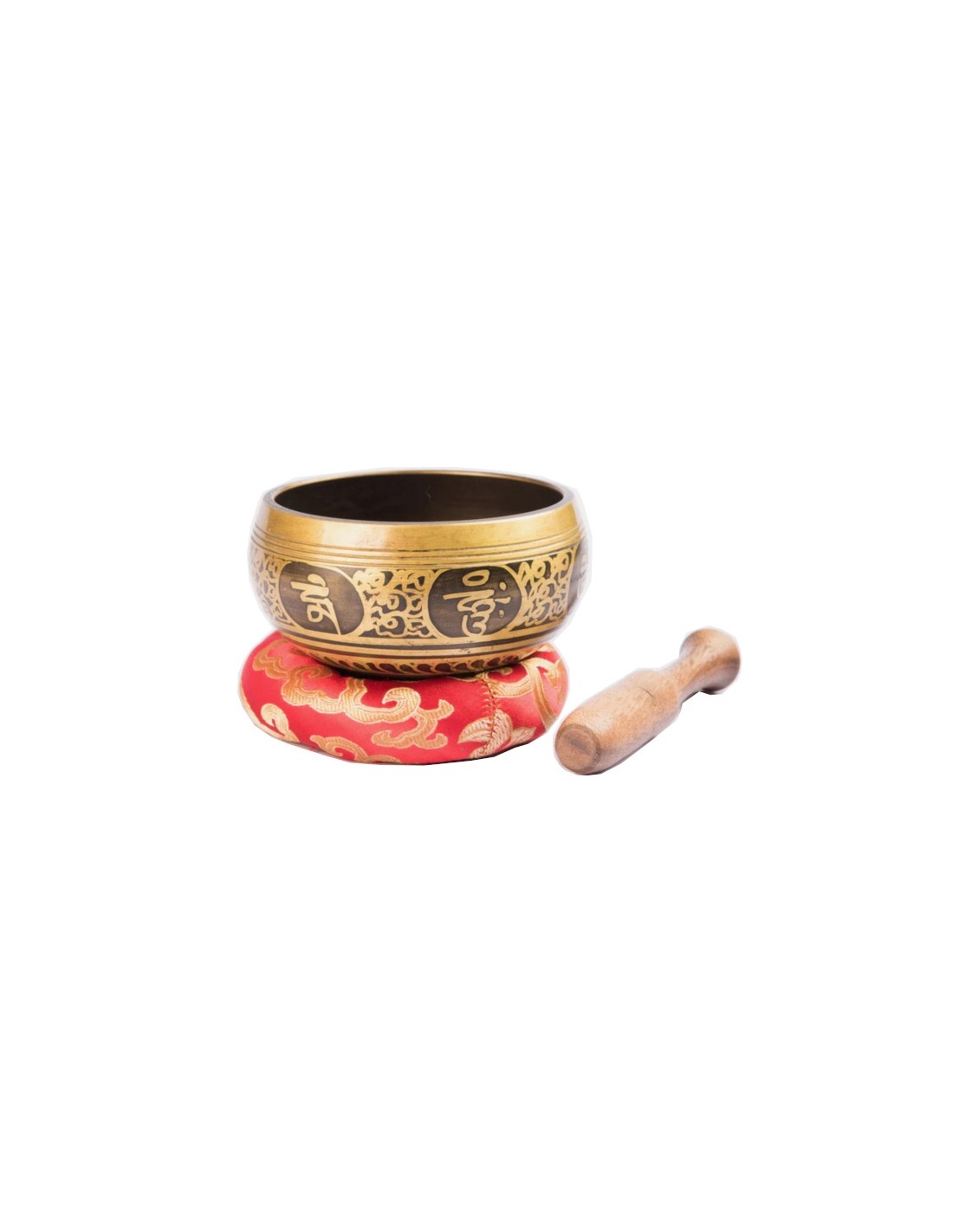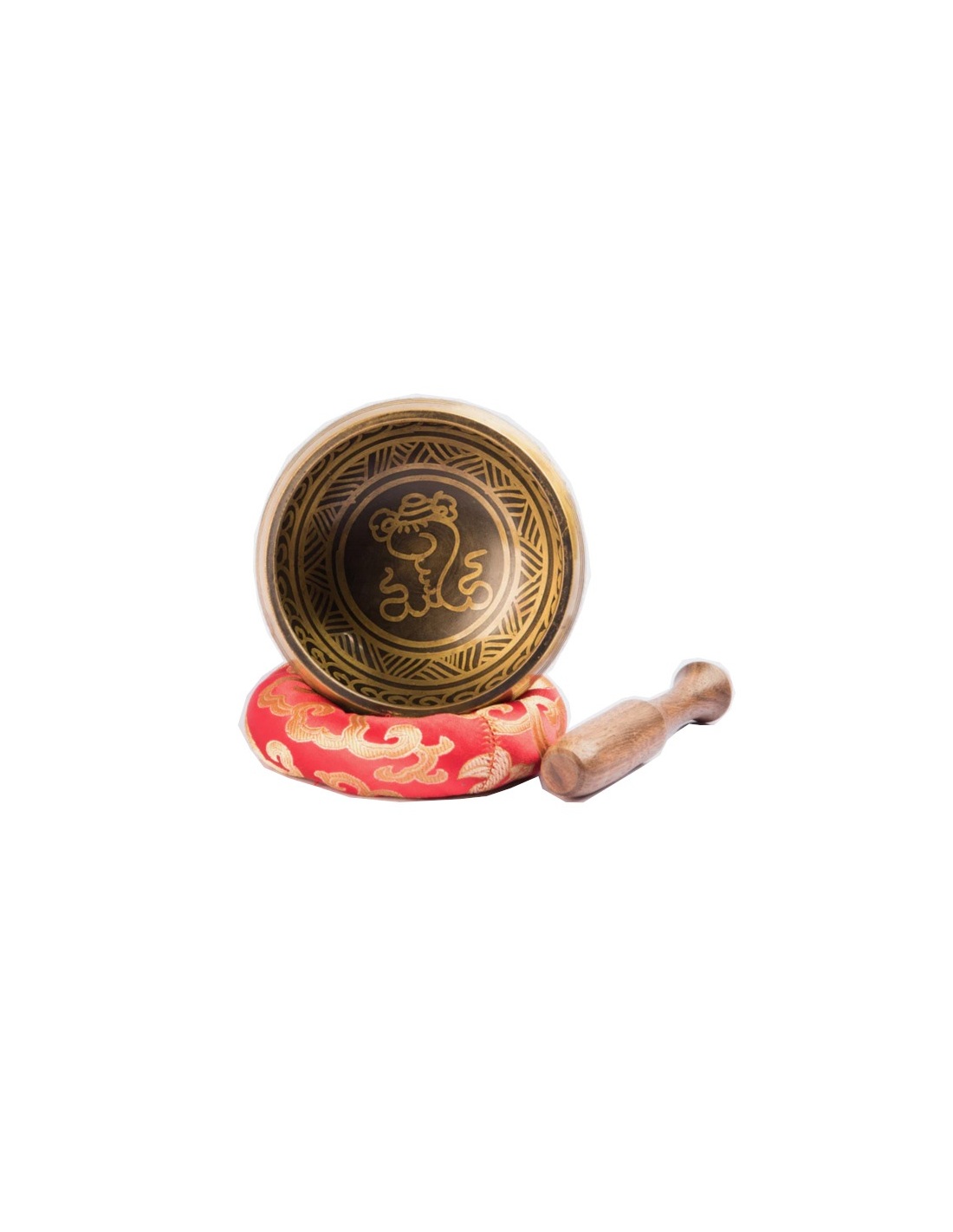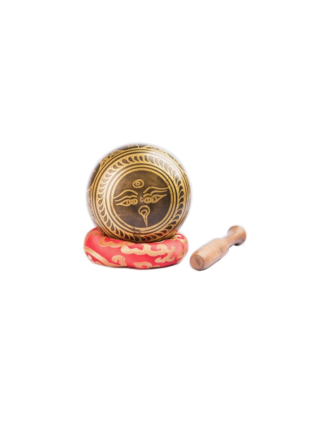 12cm Antique Buddha Eye Tibetan bowl with red ring cushion, wooden striker. Made in Nepal. Each bowl is semicircular and is composed of 7 metals: Iron, Copper, Zinc, Brass, Mercury, Gold, and Silver, each of which represents 7 different planetary influences: Gold , the sun Silver , the moon Mercury , Mercury Copper , Venus Iron , Mars Tin , Jupiter Lead , Saturn.
